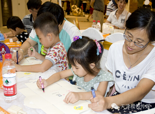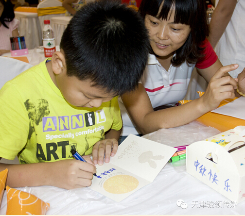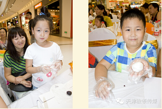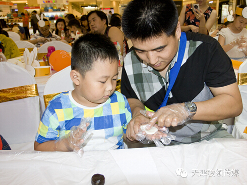 月饼DIY活动中融入很多亲子互动(月饼DIY,月饼盒DIY,祝福贺卡DIY,赠送月饼等环节),大人小孩一起动手,合作完成,渲染了温馨的中秋节团圆氛围。