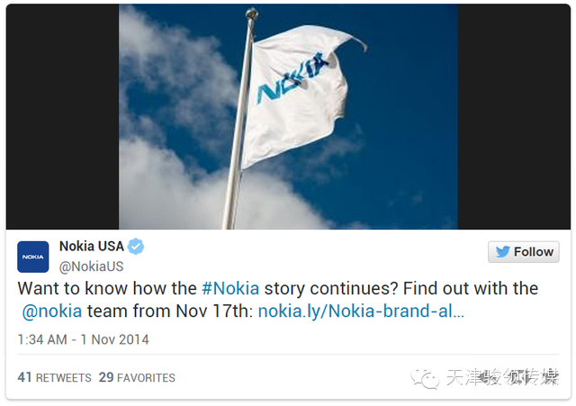 11月6日,诺基亚官方微博正式更名为微软Lumia,同时,诺基亚已经将自己在Facebook、Twitter以及其他社交网站的账户更名为 “微软Lumia”。