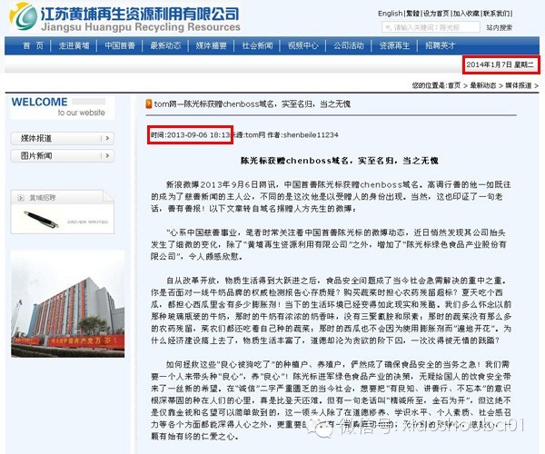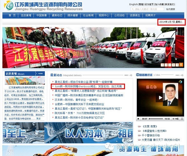 正在小编百思不得其解,一筹莫展之时,突然间在往日的新闻中,发现了些许蛛丝马迹。这是两张来自于陈光标先生官方网站上的截图,时间定格在2014年1月7日。可见网站当时还是可以正常浏览的。