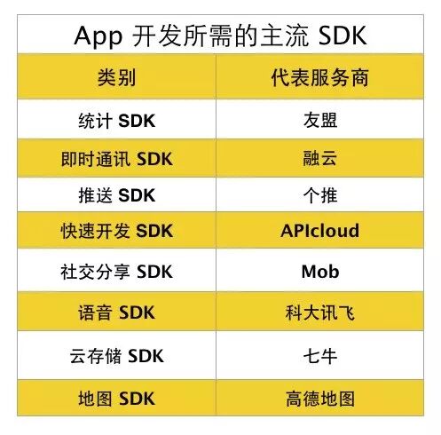 云存储sdk:通过云存储sdk可以把用户数据快速存储在云端服务器上,同时利用全网加速和数据处理的功能,让App的用户体验更加优质,以此为代表的主要是七牛、又拍云等云存储团队。