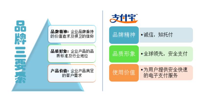 所以,没有任何悬念的——在品牌三要素中已经严重趋同的产品价值(为用户提供电子支付服务)和品质形象(安全支付)之外,支付宝选择了“诚信,知托付”的品牌精神作为与竞争者相区隔和差异化竞争的突破口。